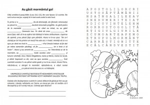 Fişa oferă un text (Luca 24,1-12) din care lipsesc 12 cuvinte. Ele sunt însă indicate sub text, trebuind doar să fie puse la poziţiile lor corecte. Aceste 12 cuvinte sunt apoi ascunse într-un careu de litere. După descoperire rămân 46 de litere nefolosite. Acestea citite dau un mesaj… care oare? În fine, mai există şi un mic desen de colorat.