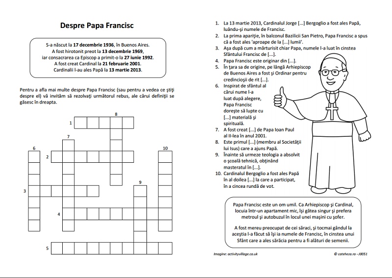 Fişa de mai jos propune un mic şi uşor rebus, cu 10 definiţii. Există aici şi o versiune online a acestei fişe. Dacă vreţi doar o foaie de colorat cu Papa Francisc (deşi… haina lui e albă… sunt puţine elemente de colorat), daţi click aici.