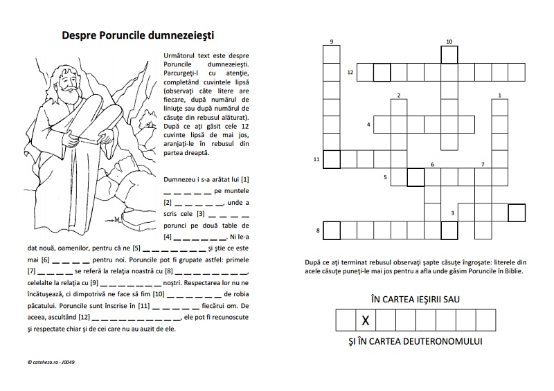 Se dă un text despre Poruncile dumnezeieşti, în care trebuie completate cuvintele lipsă (observându-se câte litere are fiecare, după numărul de liniuţe sau după numărul de căsuţe din rebusul aflat în dreapta în fişă). După ce s-au găsit cele 12 cuvinte lipsă, acestea trebuie puse în rebus. Şi mai vine o provocare cu aşezarea celor 7 litere evidenţiate astfel încât (împreună cu X-ul dat) să răspundă unei întrebări.