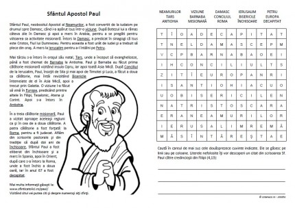 Fişa include o scurtă biografie a Apostolului Neamurilor (inspirată din textul de pe SfintiCatolici.ro), în care sunt subliniate 15 cuvinte. Acestea au fost „ascunse” în careul alăturat biografiei. După descoperirea lor, literele rămase nefolosite vor forma un citat din scrisoarea Sf. Paul către Filipeni.
