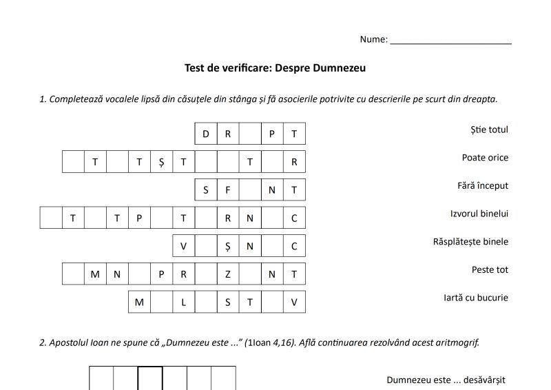 Fişa aceasta poate fi utilă după o lecţie despre Dumnezeu. Conţinutul testului este inspirat din capitolul „Despre Dumnezeu” din „Abecedarul credinţei. Catehism greco-catolic pentru copii”, apărut la Viaţa Creştină în 2013. O variantă nouă de prezentare a lecției se găsește pe Prima.Cateheza.ro.