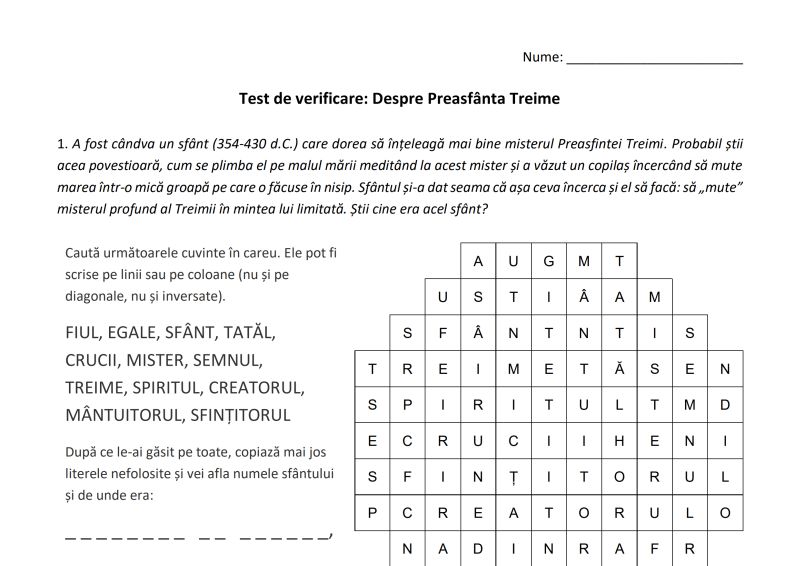 Fişa aceasta poate fi utilă după o lecţie despre Preasfânta Treime. Conţinutul testului este inspirat din capitolul „Despre Preasfânta Treime” din „Abecedarul credinţei. Catehism greco-catolic pentru copii”, apărut la Viaţa Creştină în 2013. O variantă nouă de prezentare a lecției se găsește pe Prima.Cateheza.ro.