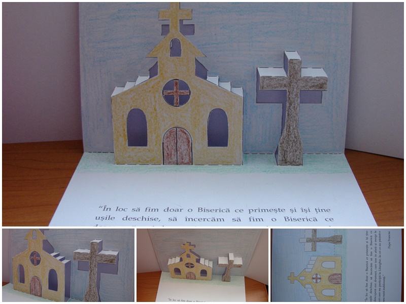 Inspirat de acele modele am realizat o biserică cu o cruce lângă, folosind tehnica kirigami. Rezultatul, pus într-un carton colorat, poate fi o felicitare. Când se deschide se „ridică” biserica şi crucea şi există un citat din Papa Francisc. În PDF-ul dat pentru listare a doua pagină este fără citat dacă doriţi să personalizaţi acel text. Important: ca o excepţie la regula „oricie linie se taie”, liniile îngroşate (de la uşă, respectiv de la geamul rotund) se lasă netăiate. Indicaţiile cu îndoire munte/vale nu există, dar exemplul făcut ar trebui să fie sugestiv şi să dea de înţeles cum se realizează.