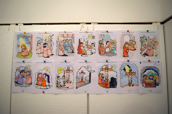 Un set de imagini (destul de mari pentru o tipărire decentă în format A5) au fost unite într-o „cărțulie” (în Word este setat tip booklet, dar dacă aveți probleme puteți descărca fișierul PDF și să fiți atent cum listați față verso). Desenele sunt realizate de Las Melli, iar urmărind linkul de la final veți găsi și imaginile și cărțulia (Word+PDF). De reținut că nu sunt stațiunile tradiționale ale Căii Crucii!