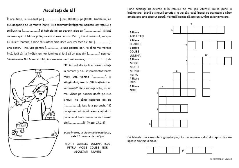 Această fişă (cu desenul © Fano) prezintă textul de la Matei 17,1-9 (Schimbarea la Față a lui Isus), din care au fost alese zece cuvinte. Ele trebuie aşezate în text și în rebusul din dreapta. Soluţia este unică (dacă nu …