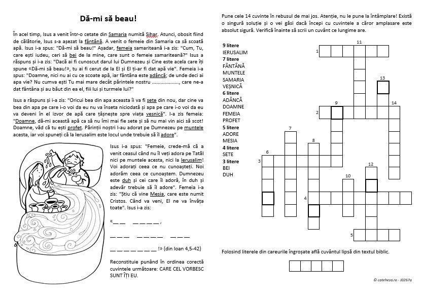 Această fişă (cu desenul © Fano) prezintă textul de la Ioan 4,5-42 (întâlnirea lui Isus cu femeia samariteană), din care au fost alese patrusprezece cuvinte. Ele trebuie aşezate în rebusul din dreapta. Soluţia este unică (dacă nu se pun cuvintele …