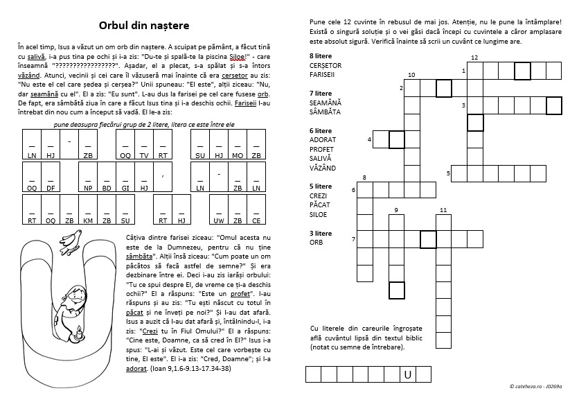 Această fişă (cu desenul © Fano) prezintă textul de la Ioan 9,1-41 (Isus vindecă un orb din naștere), din care au fost alese douăsprezece cuvinte. Ele trebuie aşezate în rebusul din dreapta. Soluţia este unică (dacă nu se pun cuvintele …