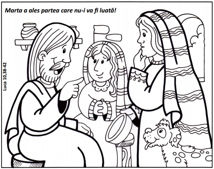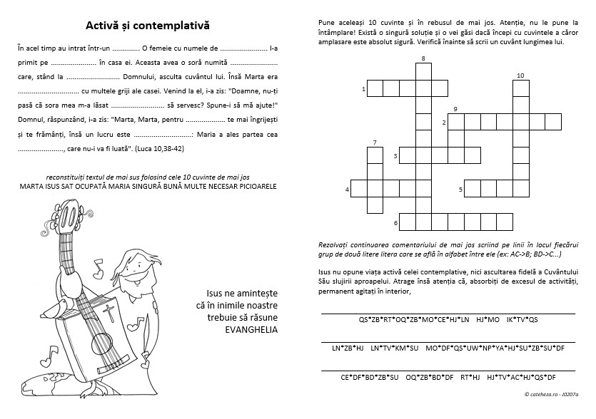 Această fişă (cu desenul © Fano) prezintă textul de la Luca 10,38-42 (întâlnirea lui Isus cu surorile Maria și Marta), din care au fost alese zece cuvinte. Ele trebuie aşezate în textul biblic dar și în rebusul din dreapta. Soluţia …