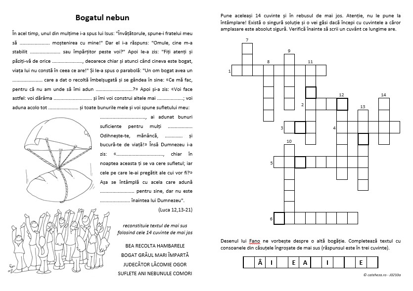 Această fişă (cu desenul © Fano) prezintă textul de la Luca 12,13-21 (parabola cu bogatul cel nebun), din care au fost alese patruspreze cuvinte. Ele trebuie aşezate în textul biblic dar și în rebusul din dreapta. Soluţia este unică (dacă …
