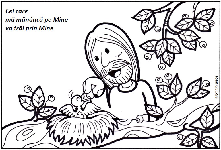 Fişa propune un desen de colorat şi un pasaj evanghelic ce trebuie reconstuit pornind de la cuvintele indicate. În original (originalul spaniol) fişa este pentru duminica a 20-a de peste an din calendarul romano-catolic, anul B, lectura evanghelică a zilei …
