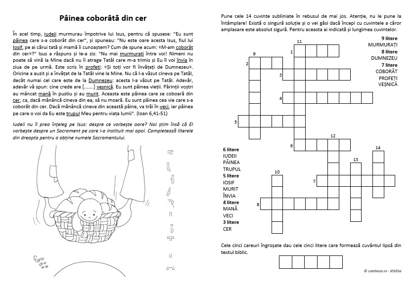 Această fişă (cu desenul © Fano) prezintă textul de la In 6,41-51 (discursul lui Isus despre pâinea vieții), din care au fost alese patrusprezece cuvinte. Ele sunt grupate după lungime şi trebuie aşezate la locul lor în rebusul din dreapta. …