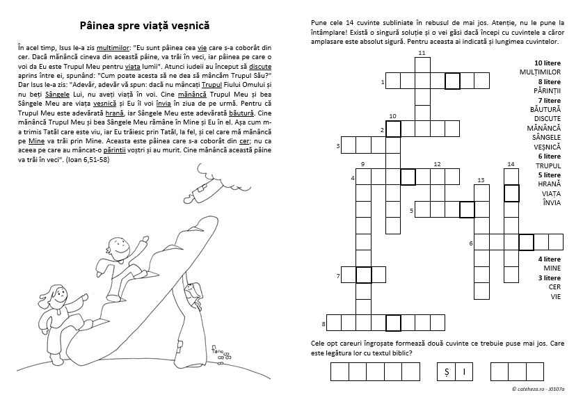 Această fişă (cu desenul © Fano) prezintă textul de la In 6,51-58 (discursul lui Isus despre pâinea vieții), din care au fost alese patrusprezece cuvinte. Ele sunt grupate după lungime şi trebuie aşezate la locul lor în rebusul din dreapta. …
