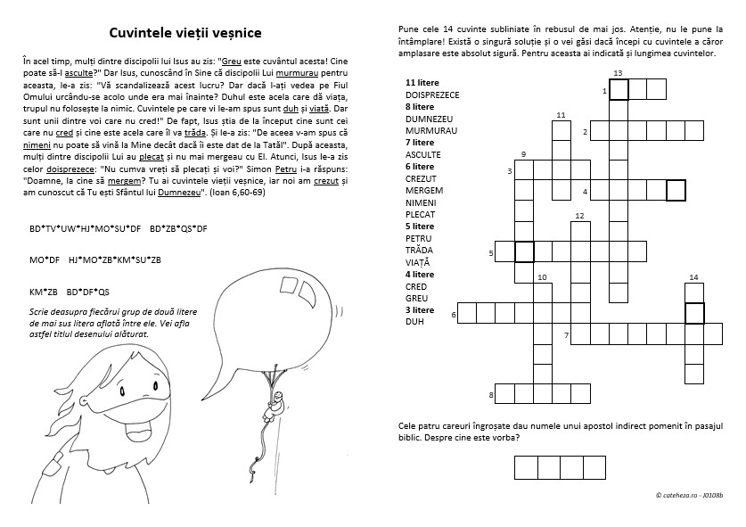 Această fişă (cu desenul © Fano) prezintă textul de la In 6,60-69 (discursul lui Isus despre pâinea vieții), din care au fost alese patrusprezece cuvinte. Ele sunt grupate după lungime şi trebuie aşezate la locul lor în rebusul din dreapta. …