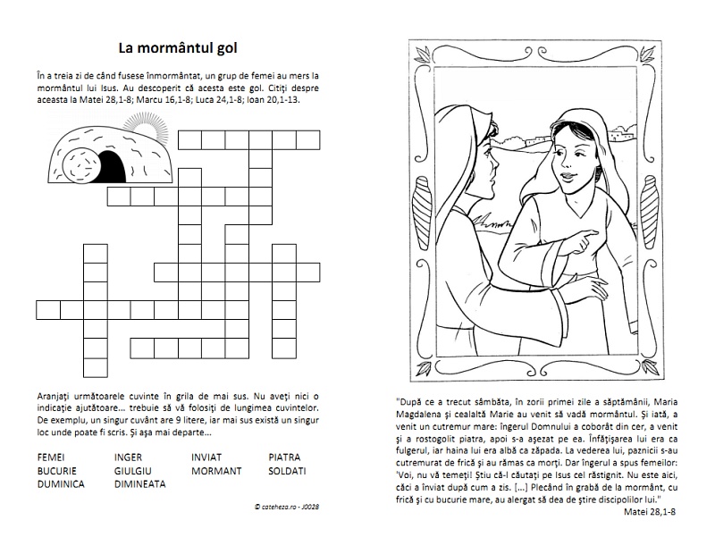 O fişă utilă în contextul sărbătorii Învierii Domnului (sau pentru Duminica mironosiţelor). Include două variante de rebus: într-una au cuvintele şi trebuie să le plaseze în careu (după lungimea lor şi potrivire); în cealaltă trebuie să descopere cuvintele dintr-un text …