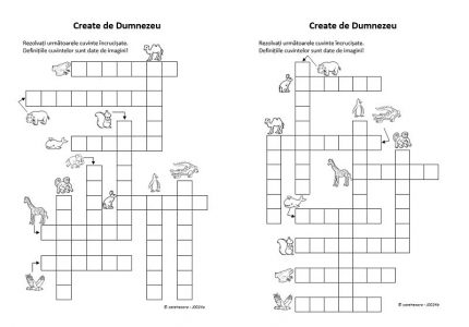 O fişă foarte simplă ce poate fi utilă când se vorbeşte copiilor despre Creaţie. Copiii trebuie să identifice nişte animale după imaginile ce sunt pe post de definiţii. Sunt în total 12 animale. Nu ar trebui să ridice probleme copiilor din primele clase de şcoală.