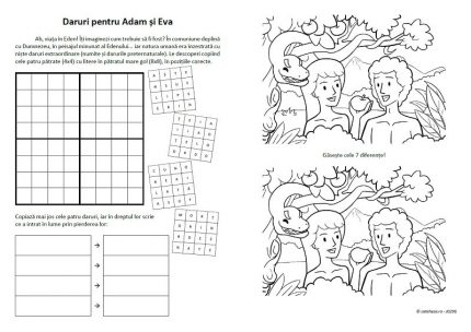 Această fişă este pe tema stării primilor oameni în Eden, mai exact despre darurile preternaturale, ce trebuie descoperite punând patru careuri 4×4 într-un careu 8×8, astfel încât textul ce se citește să fie tocmai lista acestor daruri. Apoi trebuie completate consecințele păcatului strămoșesc, prin pierderea acestor daruri. În fine, o a doua parte a fișei propune un joc tip găsiți diferențele, fiind șapte în total.
