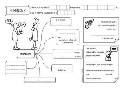 O planșă (foaie A4) ce poate fi folosită ca suport la predarea unei lecții despre Porunca 8. Planșa rezumă conceptele cheie, iar copiii au de scris doar câteva cuvinte. Ca partea catehetică se poate vedea secţiunea despre Porunca a 8-a din „Abecedarul credinţei”. Fișierul dat spre descărcare oferă și „rezolvarea” (adică planșa cu cuvintele completate).