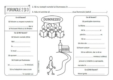 O planșă (foaie A4) ce poate fi folosită ca suport la predarea unei lecții despre Porunca 1. Planșa rezumă conceptele cheie, iar copiii au de scris doar câteva cuvinte. Ca parte catehetică se poate vedea secţiunea despre Porunca 1 din „Abecedarul credinţei”. Fișierul dat spre descărcare oferă și „rezolvarea” (adică planșa cu cuvintele completate).