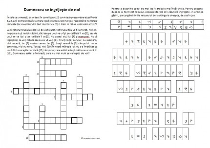 Fişa se bazează pe textul de la Matei 6,22-33 (care în ritul bizantin corespunde Duminicii a treia după Rusalii), în care este prezentat un fragment din predica de pe munte. Din fişă lipsesc 12 cuvinte, care în schimb trebuie aranjate în rebus, fiecare după numărul indicat. Rebusul are nişte căsuţe îngroşate: ele trebuie aşezate în cheia de decriptare (atenţie: cheia se completează parcurgând rebusul pe linii, de la stânga la dreapta, de sus în jos). Având cheia se poate descifra textul ultim, care este de fapt din pasajul evanghelic amintit.