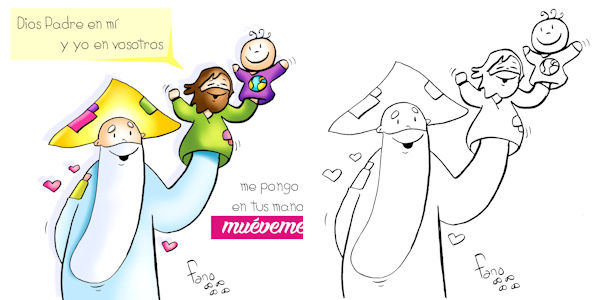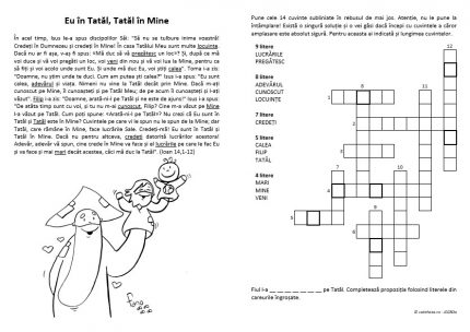 Această fişă (cu desenul © Fano) prezintă textul de la Ioan 14,1-12 (Isus se prezintă ca fiind calea, adevărul şi viaţa), din care au fost alese patrusprezece cuvinte. Ele trebuie aşezate în rebusul din dreapta. Soluţia este unică (dacă nu se pun cuvintele la întâmplare, ci se pornește de la cele care au o unică amplasare posibilă). Există și o provocare suplimentară.