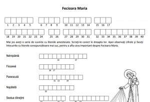 În această fişă punctul de plecare îl reprezintă o serie de cuvinte cu literele amestecate. Trebuie scrise corect în spaţiile din dreapta. Sunt apoi indicate în dreptul unor căsuţe nişte cifre: asocierile litere-cifre trebuie folosite apoi în partea de sus a paginii pentru a afla ceva important despre Fecioara Maria.