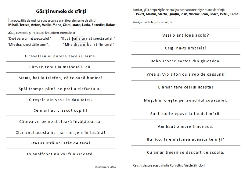 O fişă interesantă de descoperit numele unor sfinţi în propoziţii. Acestea sunt propoziţii normale, nimic religios, dar în ele sunt ascunse nume de sfinţi. De exemplu în propoziţia următoare e ascuns cuvântul balaur: „După bal a urmat spectacolul.” Aţi observat? Încă o dată: „După bal a urmat spectacolul.” Similar sunt ascunse şi numele de sfinţi. După găsirea numelor puteţi discuta despre cei ce le-au purtat.