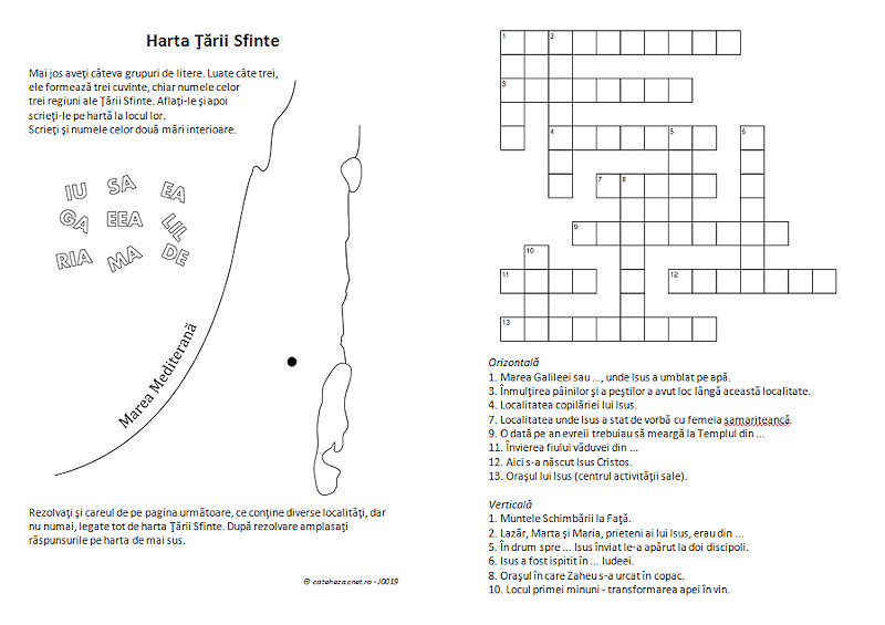 În această fişă sunt incluse mai multe jocuri. În primul rând din grupurile de litere trebuie reconstituite numele celor trei regiuni majore din Ţara Sfântă. Apoi ele trebuie amplasate pe hartă, plus scrise denumirile celor două mări de pe Iordan. Apoi e un mic rebus cu locuri din Ţara Sfântă – după rezolvare, ele trebuie plasate pe hartă.