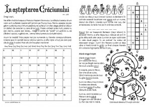Continuăm proiectul cu şase fişe pentru Postul Crăciunului. Explicaţii găsiţi la prezentarea primei fişe. În această a doua fişă copiii găsesc trei jocuri şi un desen de colorat. Primul joc e de tipul „descifraţi textul”. Textul e scris în spirală şi pentru a fi descifrat trebuie doar înlocuite cifrele scrise în careuri cu literele care le corespund. Al doilea joc e foarte simplu: nişte litere sunt scrise amestecat şi trebuie copiate corect pentru a da un nume de localitate. În fine, prin toată fişa sunt scrise 10 cuvinte subliniate. Ele aşezate într-o grilă vor da pe verticală o explicaţie.