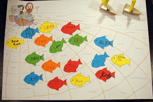 Iată o activitate cu copiii potrivită pentru discutarea pasajului cu pescuirea minunată (Luca 5,1-15 sau Ioan 21,1-12) – despre faptul că, aşa cum năvodul adună atâţia peşti, şi Isus doreşte să îi adune pe toţi oamenii în iubirea Tatălui; despre importanţa la a ne lăsa prinşi în năvodul Bisericii. Noi am folosit-o la prima întâlnire din noul an catehetic, dorind să realizăm o activitate în care să apară toate numele copiilor înscrişi la grupele noastre de cateheză. Am ales imaginea năvodului şi a peştilor, şi ne-am gândit la mai multe variante de realizare – inclusiv la aceea de a găsi sau confecţiona din sfoară o plasă care să semene a năvod. Nu am găsit ceva potrivit, şi confecţionarea manuală ar fi cerut prea mult timp – şi îndemânare 🙂 – dar dacă reuşiţi aşa ceva, ar fi mare efect.