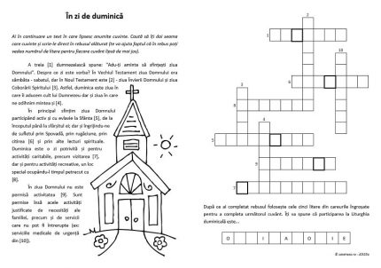 Această fişă include un text despre Porunca a III-a, bazat pe capitolul „A treia poruncă dumnezeiască”, din „Abecedarul credinţei. Catehism greco-catolic pentru copii”, apărut la Viaţa Creştină în 2013. În acest text 10 cuvinte lipsesc și trebuie scrise direct în rebusul alăturat (ajută faptul că din rebus se poate vedea câte litere are respectivul cuvânt). Există și o provocare suplimentară, folosind literele îngroșate din rebus.