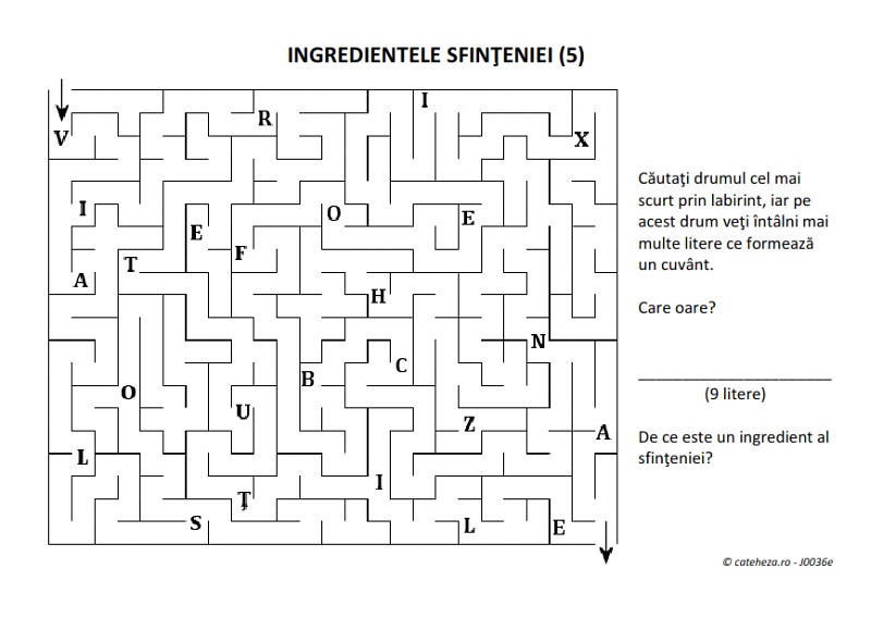 Cele şapte fişe (A5) includ labirinturi: rezolvându-le, pe drum se găsesc nişte litere ce dau şapte ingrediente ale sfinţeniei. Aceste fişe se pot folosi de exemplu cu un grup de copii sau adolescenţi, după identificarea celor şapte ingrediente putându-se discuta despre tema sfinţeniei (de ce sunt acelea ingrediente pentru sfinţenie?).