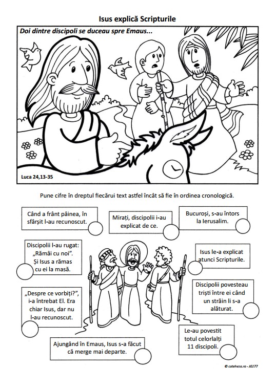 Fişa propune un desen de colorat şi o activitate (de descoperit un text). În original (originalul spaniol) fişa este pentru a 3-a duminică a Paștelui din calendarul romano-catolic, anul A, lectura evanghelică a zilei fiind de la Luca, capitolul 24, versetele 13-35.