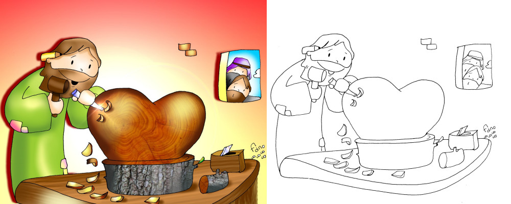 Această fişă (cu desenul © Fano) prezintă textul de la Mc 6,1-6 (cu Isus privit cu suspiciune de cei ce îl ştiau drept lemnar), din care au fost alese patrusprezece cuvinte. Ele sunt grupate după lungime şi trebuie aşezate la locul lor în rebusul din dreapta. Soluţia este unică (dacă nu se pun cuvintele la întâmplare, ci se porneşte de la cele care au o unică amplasare posibilă). O provocare suplimentară însoţeşte desenul: din literele din careurile îngroşate se obţine un cuvânt legat de textul biblic.