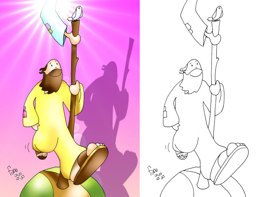 Această fişă (cu desenul © Fano) prezintă textul de la Mc 6,7-13 (cu Isus trimiţându-şi discipolii doi câte doi), din care au fost alese patrusprezece cuvinte. Ele sunt grupate după lungime şi trebuie aşezate la locul lor în rebusul din dreapta. Soluţia este unică (dacă nu se pun cuvintele la întâmplare, ci se porneşte de la cele care au o unică amplasare posibilă). O provocare suplimentară însoţeşte desenul: reconstituirea unei mici explicaţii la textul biblic dintr-un mare sfânt.