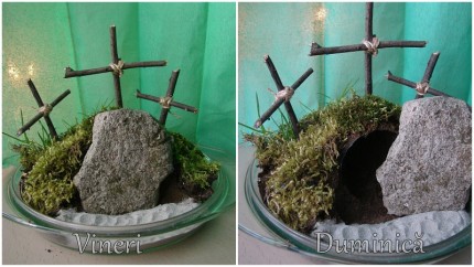 Iată o activitate foarte simplă – după pretenţii, desigur – care poate să fie de folos în familie în perioada Paştilor. În fapt se poate construi în Vinerea Mare, acoperind intrarea în mormânt cu o piatră. Apoi, în Duminica Învierii piatra se mută de la intrare şi toată scena este potrivită marii sărbători. În principiu activitatea nu este pretenţioasă şi după imaginaţie se poate adapta.