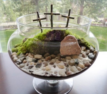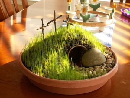 De exemplu noi am folosit nişte pământ de flori (un rest avut), pe care l-am aşezat într-un capac de vas yena (poate fi orice, chiar şi un capac de cutie de carton, o tavă, ce aveţi la îndemână) peste o secţiune dintr-o sticlă de 0,3l de suc. La fel de bine poate fi un pahar mic, un ghiveci mic sau ce vă imaginaţi ca să ţină pe post de mormânt. Ca să fie mai estetic, peste pământ am aşezat nişte muşchi găsit pe lângă bloc (sau puteţi pregăti scena din timp, plantând grâu – după câteva zile veţi avea verdeaţă din plin). Mai trebuie o piatră pentru mormânt, eventual alte pietre mici pentru zona din faţa mormântului (noi am avut ceva nisip). Ah, şi desigur trei cruci de lemn.