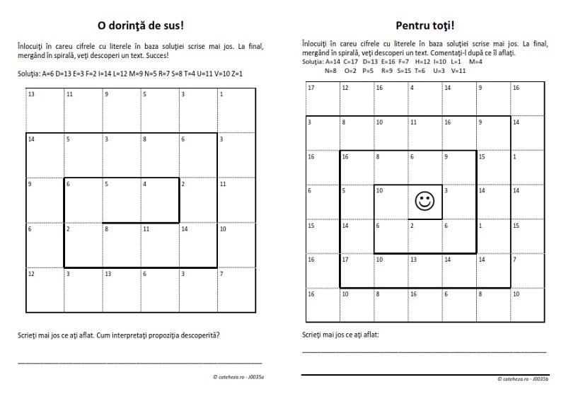 Sunt două fişe, fiecare cu o propoziţie scrisă în spirală. Pentru a o afla, trebuie folosită cheia, cu corespondenţa între numere şi litere. Urmând spirala se va afla „O dorinţă de sus!”, respectiv că e „Pentru toţi!”. Tema: sfinţenia.