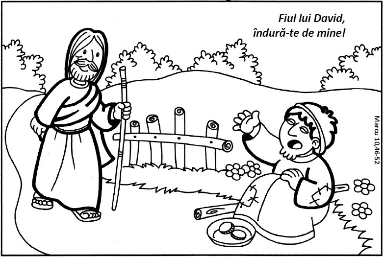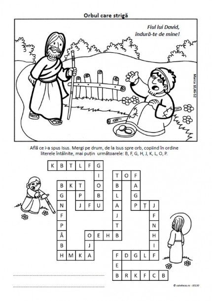 Fişa propune un desen de colorat şi un text de descoperit. În original (originalul spaniol) fişa este pentru duminica a 30-a de peste an din calendarul romano-catolic, anul B, lectura evanghelică a zilei fiind de la Marcu, capitolul 10, versetele 46-52.