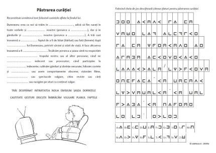 Această fişă include un text despre Porunca a VI-a și despre Porunca a IX-a, bazat în special pe capitolul „A șasea poruncă dumnezeiască”, din „Abecedarul credinţei. Catehism greco-catolic pentru copii”, apărut la Viaţa Creştină în 2013. În acest text 14 cuvinte lipsesc și trebuie scrise dintr-un banc de cuvinte. În a doua parte a fișei trebuie decriptat un text cu câteva sfaturi pentru păstrarea curăției.