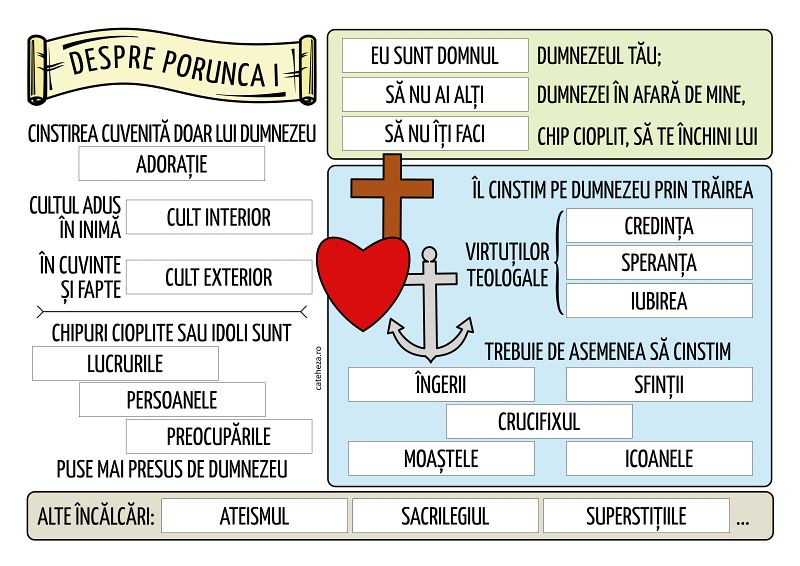 Planșa permite verificarea cunoștințelor despre Porunca I: textul ei, definirea unor concepte esențiale, încălcări… Conceperea planșei s-a bazat pe capitolele despre Porunca I din „Abecedarul credinței”.