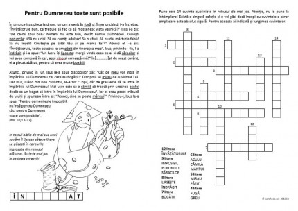 Această fişă (cu desenul © Fano) prezintă textul de la Marcu 10,17-27 (întâlnirea cu tânărul bogat și dialogul ce a urmat între Isus și apostoli), din care au fost alese patrusprezece cuvinte. Ele sunt grupate după lungime şi trebuie aşezate la locul lor în rebusul din dreapta. Soluţia este unică (dacă nu se pun cuvintele la întâmplare, ci se porneşte de la cele care au o unică amplasare posibilă). O provocare suplimentară însoţește fişa: de aflat un cuvânt lipsă din text.