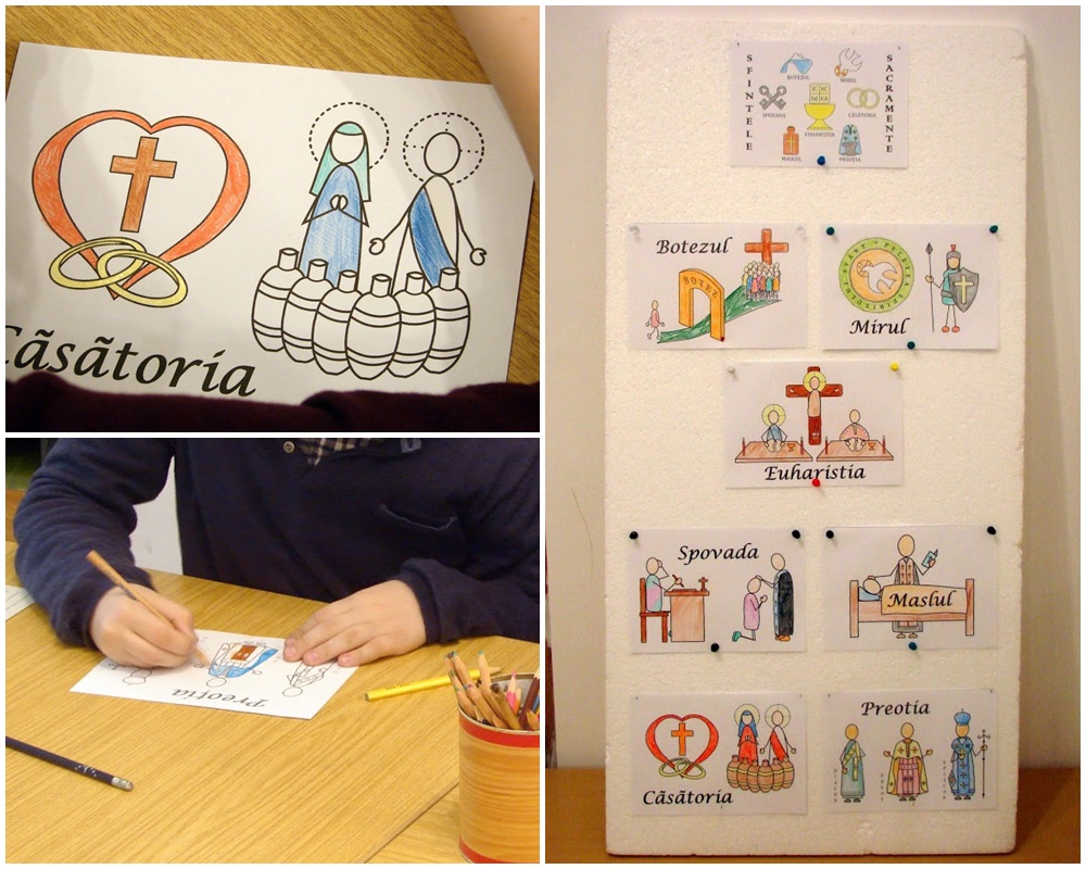 Când începem secţiunea Sacramente (de exemplu cu grupa pentru Prima Împărtăşanie) realizăm un panou pe care punem cele şapte Sacramente, iar copiii le colorează înainte. Astfel pe toată perioada cât vorbim de Sacramente le avem în faţă. Imaginile sunt cele realizate pentru „Abecedarul credinţei”.