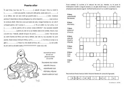 Această fişă (cu desenul © Fano) prezintă textul de la Ioan 10,1-10 (Isus se prezintă ca fiind poarta oilor), din care au fost alese douăsprezece cuvinte. Ele trebuie aşezate în text și în rebusul din dreapta. Soluţia este unică (dacă nu se pun cuvintele la întâmplare, ci se pornește de la cele care au o unică amplasare posibilă). Există și o provocare suplimentară.