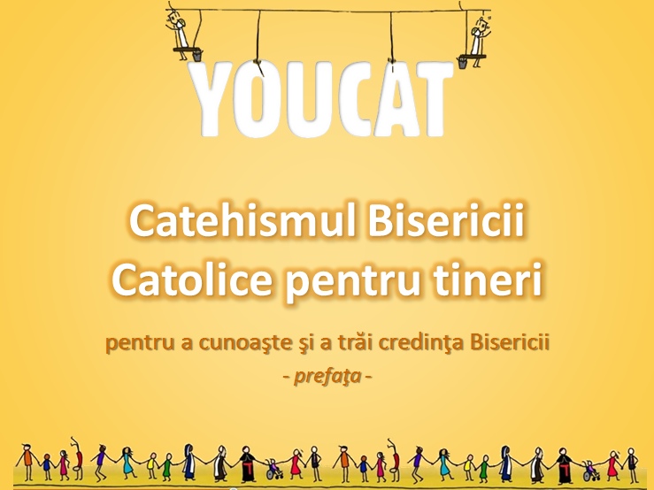 Catehismul pentru tineri, cunoscut sub numele de YouCat, are o frumoasă prefaţă semnată de Papa Benedict al XVI-lea. Parcurgerea ei poate fi un frumos îndemn pentru parcurgerea mai apoi a YouCat-ului. Vă oferit atât textul prefeţei (ca fişier Word, simplu), dar şi o prezentare ce poate fi proiectată în timpul unei discuţii pe marginea cuvintelor Papei Benedict.