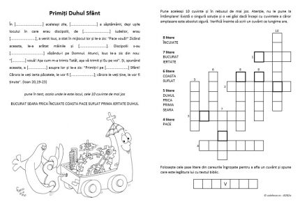 Această fişă (cu desenul © Fano) prezintă textul de la Ioan 20,19-23 (Isus revenind la Apostoli, după înviere), din care au fost alese zece cuvinte. Ele trebuie aşezate în text și în rebusul din dreapta. Soluţia este unică (dacă nu se pun cuvintele la întâmplare, ci se pornește de la cele care au o unică amplasare posibilă). Există și o provocare suplimentară.