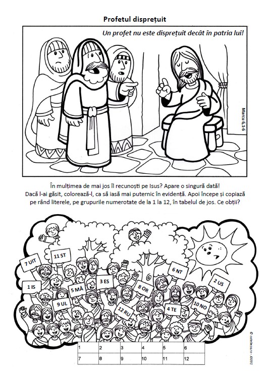 Fişa propune un desen de colorat şi apoi un desen cu o mulţime în care trebuie găsit Isus. De asemenea de reconstituit o afirmaţie despre Isus. În original (originalul spaniol) fişa este pentru duminica a 14-a de peste an din calendarul romano-catolic, lectura evanghelică a zilei fiind de la Marcu capitolul 6, versetele 1-6.