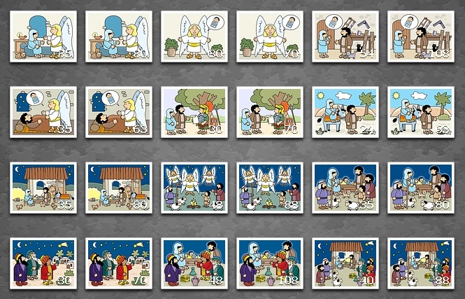 Din desenele dl. Didier Martin (vezi cartea color) despre naşterea lui Isus, câteva – 12 mai exact – au fost transformate în puzzle-uri. Descărcaţi fişierul şi lansaţi-l (nu necesită instalare). Toate puzzle-urile sunt într-un singur executabil.