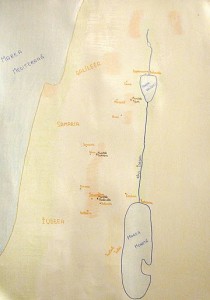 Este o activitate pentru acomodarea copiilor cu geografia Ţării Sfinte. Ca punct de pornire, pe un carton mare pe care trebuie să facem schiţa hărţii. Fidelă cât de cât 😉 . Important e să se vadă Marea Mediterană, ce mărgineşte la stânga Ţara Sfântă, apoi Iordanul cu Marea Galileei şi Marea Moartă (vedeţi aici o imagine mai mare).