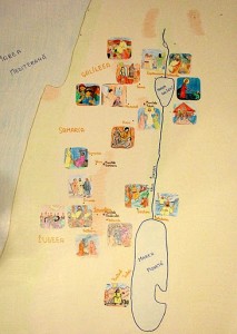 După aceasta copiilor li se dau să coloreze mici desene cu momente din viaţa lui Isus, care apoi vor fi amplasate pe hartă. Cum poate ieşi puteţi vedea într-o imagine mai mare aici, dar şi mai jos.