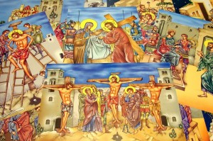 Editura Sf. Mina oferă mai multe seturi de planşe didactice. Printre ele şi un set intitulat „Jertfa din iubire”, cu imagini despre Patimile, Răstignirea, Moartea şi Învierea Mântuitorului. Sunt în total 28 de planşe color, format 48×33 cm. Sunt pe un carton destul de gros (pot fi ţinute în mână şi arătate), şi pe suprafaţă nu rămân uşor amprente (ceea ce e de bine). Pentru conservarea lor pe o durată mai mare s-ar recomanda înfolierea (care e puţin mai dificilă fiind peste format A3).